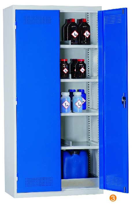 用于污染液體的存儲,可調式隔板,上下25mm可調 可移動式底部貯存盤高100mm,無縫焊接,更好防泄漏 門板的頂部及底部帶通風孔,自然通風,門開啟角度12。 隔板/貯存盤式層板每層最大承重60KG (可抽出式除外) 柜體最大承重承重:300KG